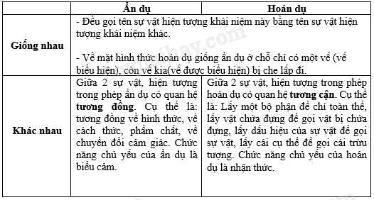 Dùng sơ đồ để chỉ ra điểm giống và khác nhau giữa ẩn dụ và hoán dụ
