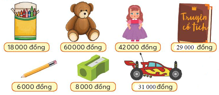 Bạn Tú có 50 000 đồng. Tú muốn mua một số đồ vật trong số các đồ vật sau. Hỏi Tú có thể mua được đồ vật nào dưới đây?