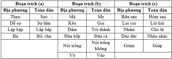 Đọc lại các đoạn trích ở bài tập 1 và bình luận về cách dùng từ ngữ địa phương bằng cách trả lời các câu hỏi sau đây: