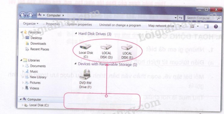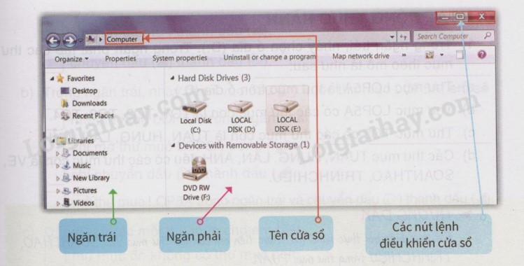 , cửa sổ Computer được mở, em có thể nhìn thấy được “bên trong” máy tính. Cửa sổ Computer được mở là do một chương trình gọi là