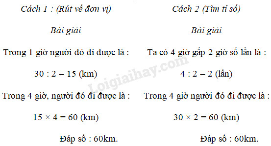 Bài toán : Một người đi xe đạp trong 2 giờ được 30km. Hỏi trong 4 giờ người đó đi được quãng đường dài bao nhiêu ki-lô-mét ? (Biết rằng quãng đường đi được trong mỗi giờ là như nhau).