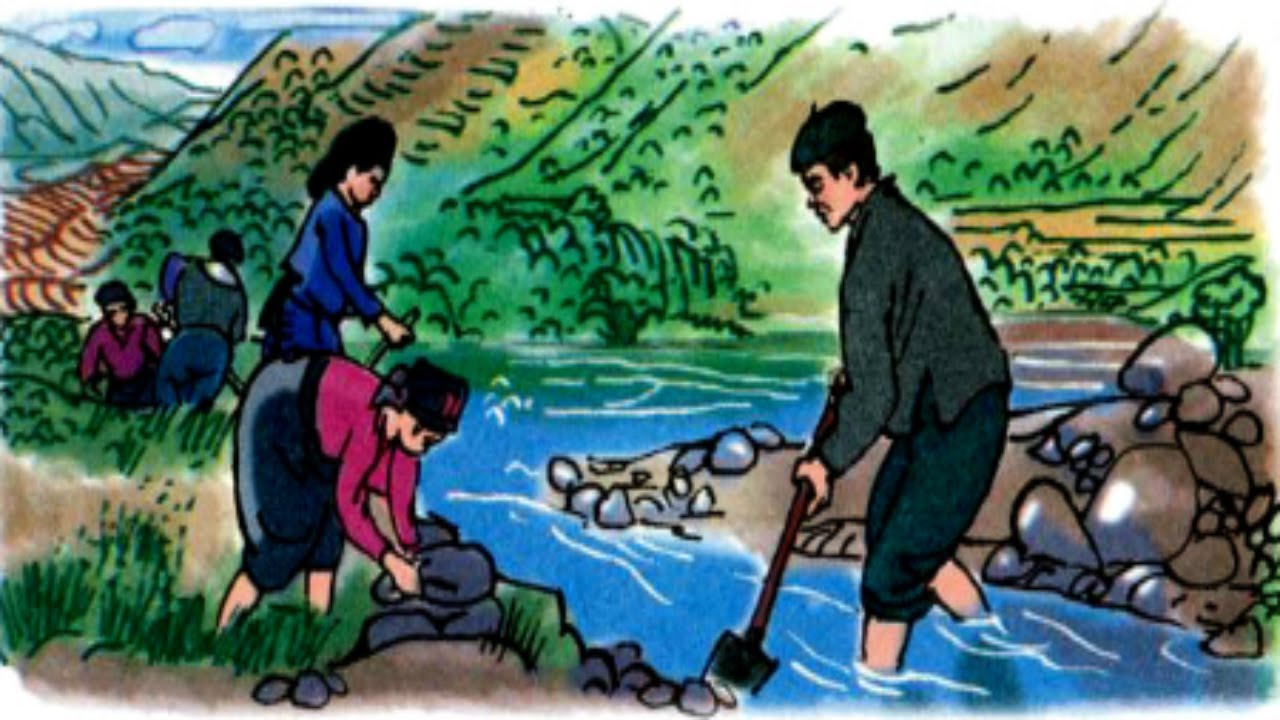 Tranh vẽ cảnh ông Phàn Phù Lìn và bà con ở miền núi đang khai thông khe mương để dẫn nước về thôn làng phục vụ sản xuất, trồng trọt.