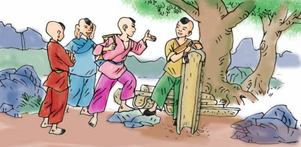 5. Đi được ít lâu, ba người lại gặp một cậu bé đang ngồi dưới gốc cây, lấy móng tay đục gỗ thành lòng máng dẫn nước vào ruộng. Cẩu Khây cùng các bạn đến làm quen và nói rõ chí hướng của ba người. Móng Tay Đục Máng hăng hái xin được làm em út đi theo.