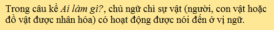 3) Chủ ngữ của câu kể Ai làm gì? có ý nghĩa: Chỉ sự vật có hoạt động được nói đến ở vị ngữ.