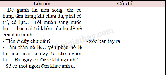 Thành:             – Tôi muốn đi sang nước họ. Để giành lại non sông, chỉ có hùng tâm tráng khí chưa đủ, phải có trí, có lực… Tôi muốn sang nước họ, xem cách làm ăn của họ, học cái trí khôn của họ để về cứu dân mình…