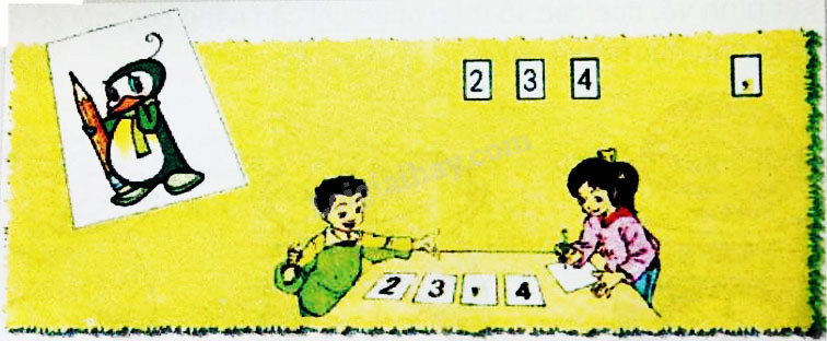 – Mỗi bạn viết một chữ số lên tấm thẻ: chẳng hạn 2, 3, 4, và “,”.