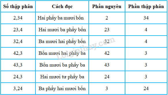 – Những chữ số ở bên trái dấu phẩy thuộc về phần nguyên, những chữ số ở bên phải dấu phẩy thuộc về phần thập phân.