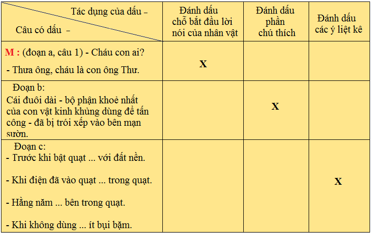 2) Trong mỗi đoạn văn trên, dấu gạch ngang có tác dụng gì? Viết kết quả vào phiếu học tập.