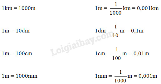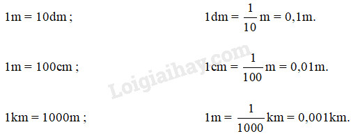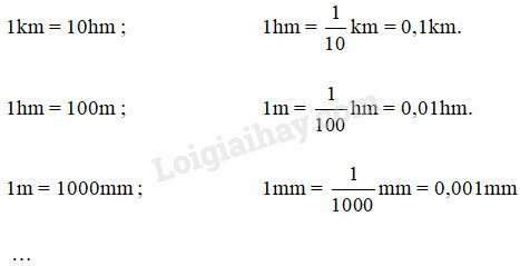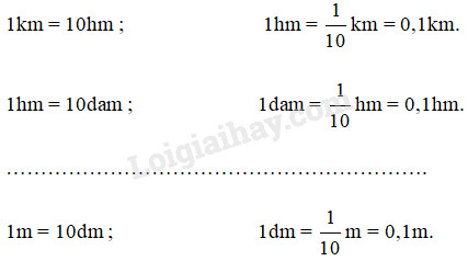 – Mỗi đơn vị đo độ dài bằng \(\frac{1}{{10}}\) (bằng 0,1) đơn vị lớn hơn liền trước nó.