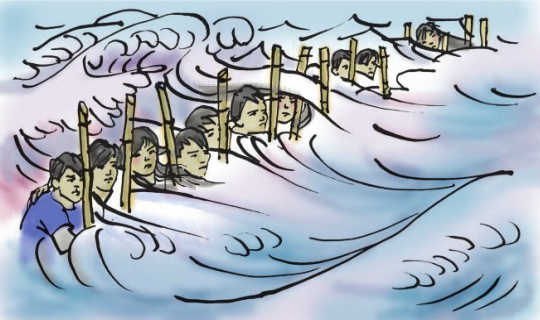3. Một tiếng reo to nổi lên, rồi ầm ầm hơn hai chục thanh niên cả nam lẫn nữ, mỗi người vác một vác củi vẹt, nhảy xuống dòng nước đang cuốn dữ. Họ khoác vai nhau thành một sợi dây dài, lấy thân mình ngăn dòng nước mặn. Nước quật vào mặt, vào ngực, trào qua đầu hàng rào sống. Họ ngụp xuống, trồi lên, ngụp xuống. Trong đám thanh niên xung kích, có người ngã, có người ngạt. Nhưng những bàn tay khoác vai nhau vẫn cứng như sắt, và thân hình họ quấn chặt lấy những cọc tre đóng chắc, dẻo như chão. Tóc dài các cô quấn chặt vào cổ các cậu con trai, mồ hôi như suối, hòa lẫn với nước chát mặn. Đám người không sợ chết đã cứu được quãng đê sống lại.