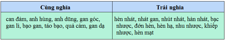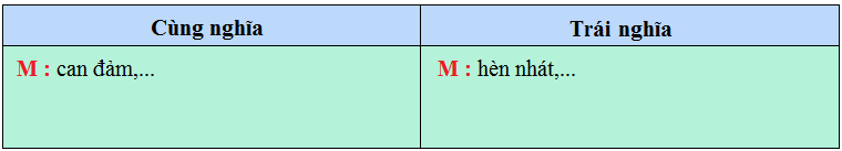 Xếp những từ sau vào hai nhóm: từ cùng nghĩa và trái nghĩa với từ dũng cảm: