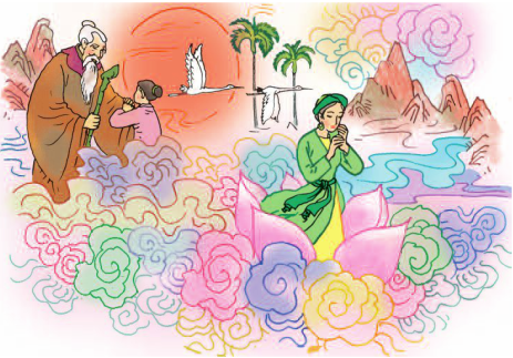 b) Họ đang làm: Ông tiên dặn dò cô gái điều gì đó, cô gái xinh đẹp bước ra từ đóa sen hồng.