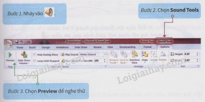 trong trang trình chiếu, màn hình hiển thị hai cách thiết lập nội dung âm thanh.