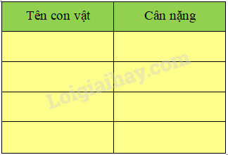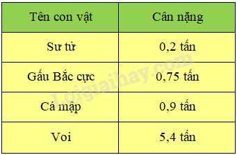 – Em đố bạn viết cân nặng của các con vật theo thứ tự từ bé đến lớn vào bảng sau :