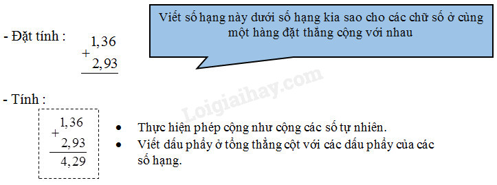 Để tính 1,36 + 2,93 = ?, thông thường ta đặt tính rồi làm như sau :
