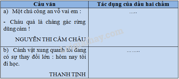 b) Viết vào vở tác dụng của dấu hai chấm trong mỗi trường hợp dưới đây: