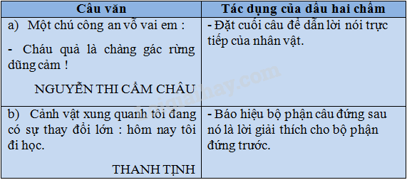Dấu hai chấm báo hiệu bộ phận câu đứng sau nó là lời nói của một nhân vật hoặc là lời giải thích cho bộ phận đứng trước.
