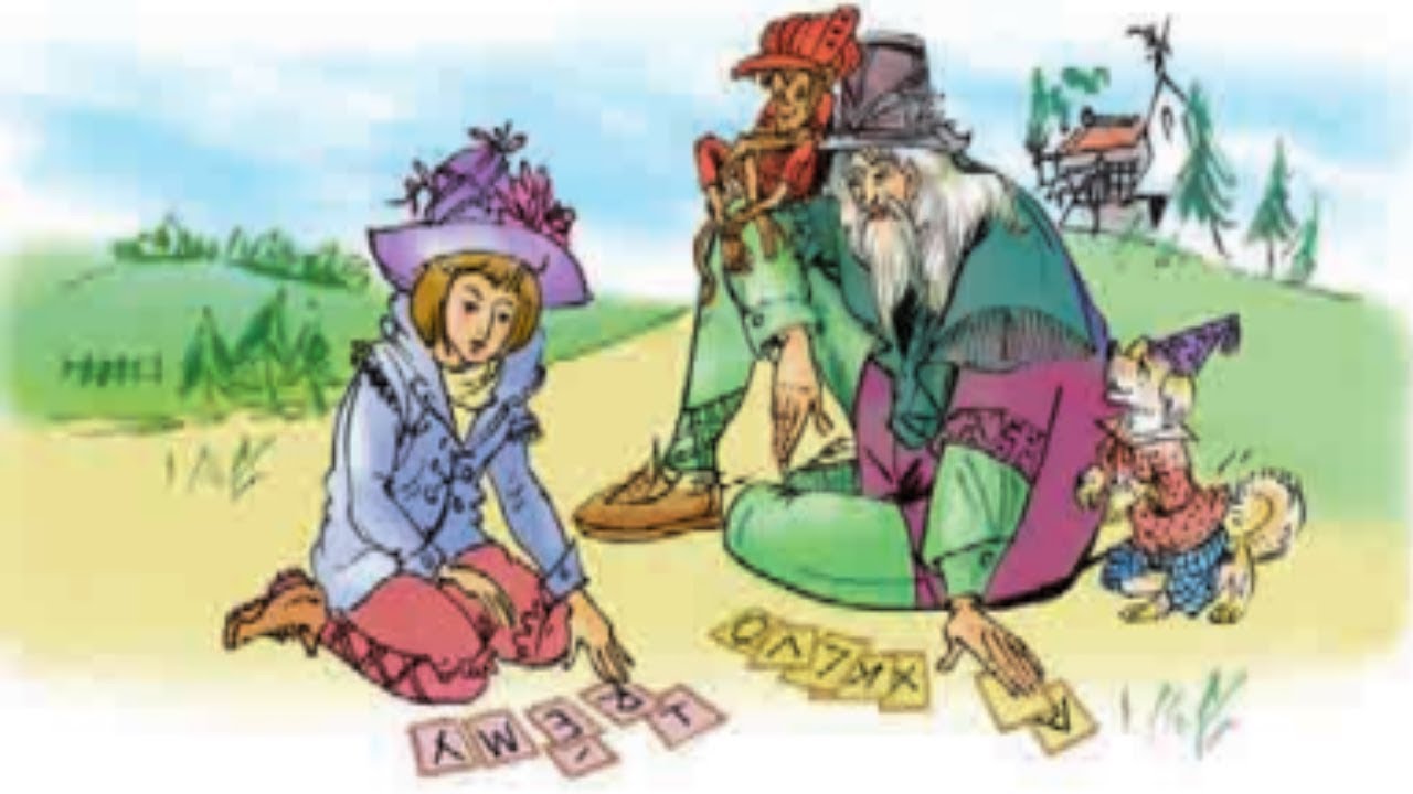 b) Trên mặt đât, trước mặt các nhân vật là những mảnh gỗ mỏng nhỏ được cắt vuông vức và có khắc các chữ cái lên đó.