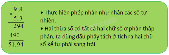 Để tính \(9,8 \times 5,3 = ?\), thông thường ta đặt tính rồi làm như sau :