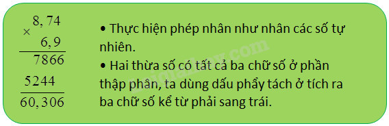 – Bước 2: Đếm xem trong phần thập phân của cả hai thừa số có bao nhiêu chữ số rồi dùng dấu phẩy tách ở tích ra bấy nhiêu chữ số kể từ phải sang trái.