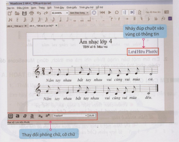 Để thay đổi thông tin tên nhạc sĩ, tựa đề, tiêu đề của bản nhạc, em nháy đúp chuột vào thông tin đó, thay đổi nội dung hoặc kích thước chữ, loại chữ theo hướng dẫn dưới rồi thực hiện chỉnh sửa