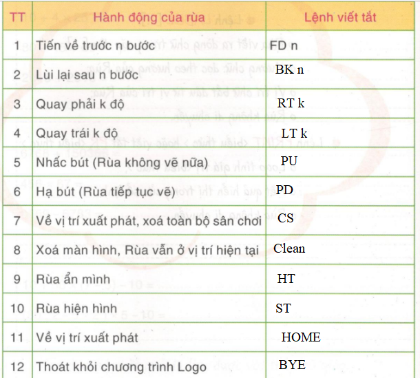 Viết lệnh viết tắt điều khiển Rùa thực hiện các hành động trong bảng sau: