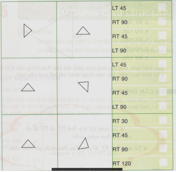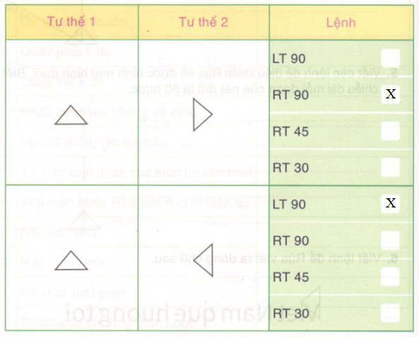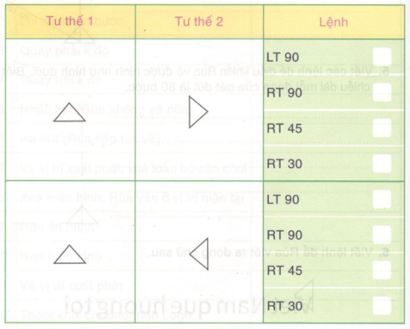 Lệnh nào đã điều khiển Rùa quay từ tư thế 1 sang tư thế 2? Đánh dấu x vào ô trống cuối câu trả lời đúng