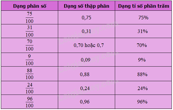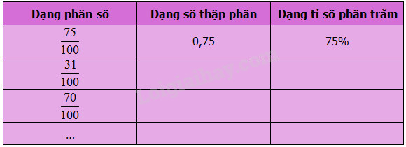Một bạn ghi ở cột đầu một phân số có mẫu số là 100 (ví dụ : \(\dfrac{{75}}{{100}}\)), bạn thứ hai viết số thập phân (0,75) ở cột 2, bạn thứ ba viết số đó dưới dạng tỉ số phần trăm ở cột 3 (75%). Các bạn có thể đổi vai cho nhau để chơi.