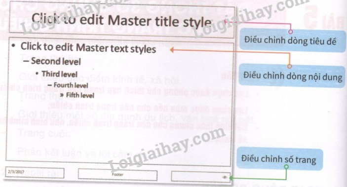 a) Sau khi đã chọn Slide Master, trên màn hình xuất hiện trang trình chiếu số 1 (trang mẫu) bao gồm các phần: