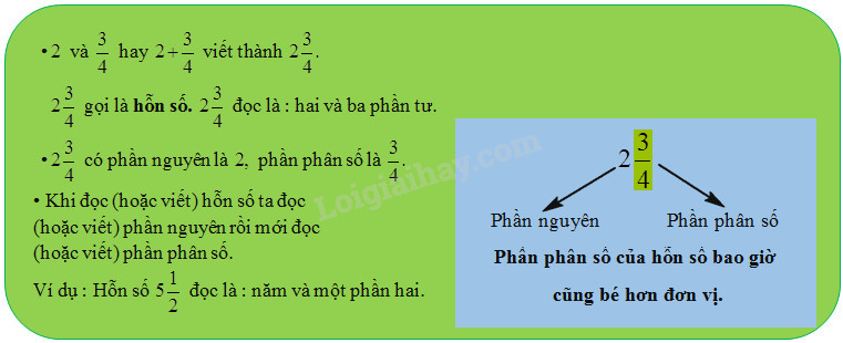 Khi đọc (hoặc viết) hỗn số ta đọc (hoặc viết) phần nguyên rồi đọc (hoặc viết) phần phân số.