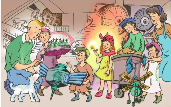 Quan sát bức tranh ta thấy: Các bạn trong tranh đang xem chiếc máy làm cho con người hạnh phúc, các vị thuốc trường sinh, một thứ ánh sáng lạ thường, chiếc máy dò tìm những kho báu trên mặt trăng.