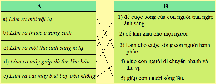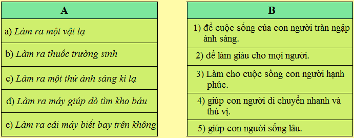2) Nối tên mỗi đồ vật các em nhỏ mơ ước sáng chế (cột A) với công dụng của nó (cột B):