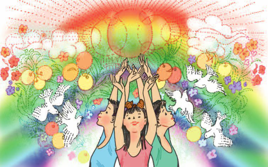 a) Bức tranh vẽ cảnh các bạn nhỏ đang ngắm nhìn những điều kì diệu mà mình mơ ước. Đó là nơi có ánh nắng ngập tràn với đàn chim bồ câu bay lượn, những chùm bóng bay đủ sắc màu. Dưới mặt đất những vườn hoa đua nhau khoe sắc.