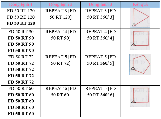 Điền các câu lệnh, số đúng vào chỗ chấm để vẽ các hình theo mẫu rồi kiểm tra lại kết quả trên máy tính:
