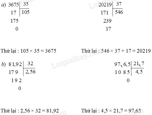 b) 81,92 : 32                            97,65 : 21,7 (thương là số thập phân)