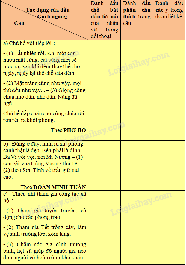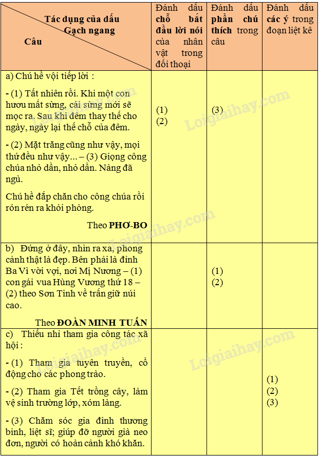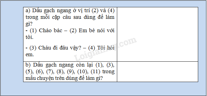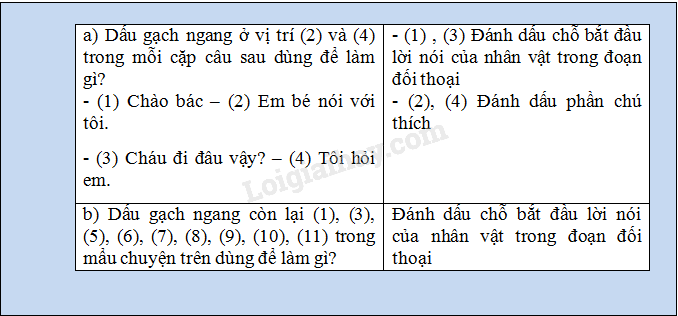 Đọc mẩu chuyện dưới đây và ghi lại tác dụng của dấu gạch ngang được sử dụng trong từng trường hợp vào bảng: