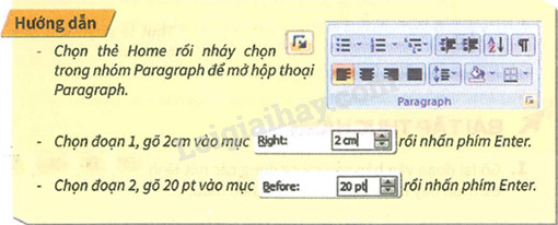 Giúp em di chuyển đoạn văn bản được chọn sang bên phải và cách lề bên phải 2cm.