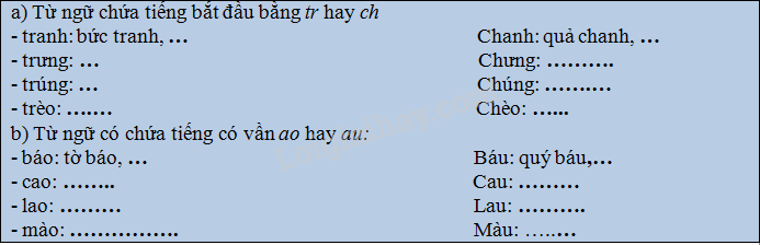 Tìm và viết và phiếu học tập những từ ngữ chứa các tiếng đã cho (chọn a hoặc b)