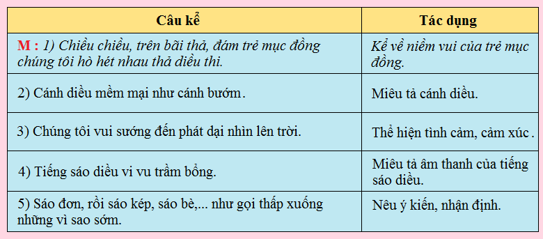 (1) Chiều chiều, trên bãi thả, đám trẻ mục đồng chúng tôi hò hét nhau thả diều thi. (2) Cánh diều mềm mại như cánh bướm. (3) Chúng tôi vui sướng đến phát dại nhìn lên trời. (4) Tiếng sáo diều vi vu trầm bổng. (5) Sáo đơn, rồi sáo kép, sáo bè,… như gọi thấp xuống những vì sao sớm.