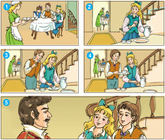 – Tranh 1: Ma-ri-a nhận thấy mỗi lần gia nhân bưng trà lên, bát đựng trà thoạt đầu rất dễ trượt trong đĩa.