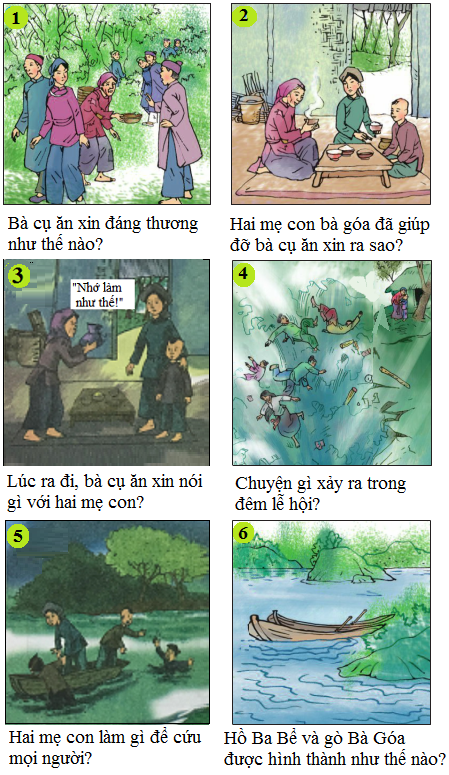 Mỗi bức tranh sau minh họa cho một sự việc của câu chuyện Sự tích hồ Ba Bể. Dựa vào tranh và trả lời câu hỏi dưới tranh, mỗi bạn kể lại một đoạn câu chuyện.