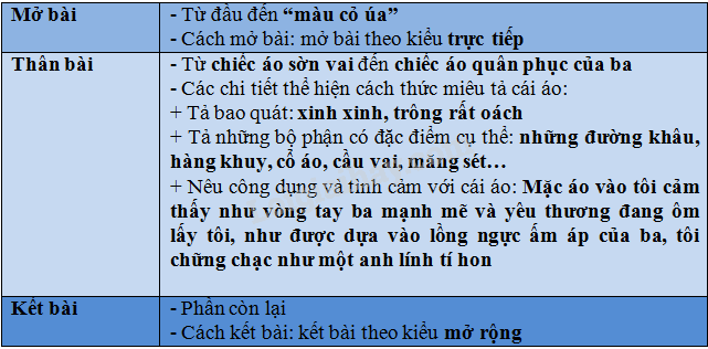 Khi cần, tôi có thể mở khuy và xắn tay áo lên gọn gàng. Mặc áo vào, tôi có cảm giác như vòng tay ba mạnh mẽ và yêu thương đang ôm lấy tôi, tôi như được dựa vào lồng ngực ấm áp của ba… Lúc tôi mặc đến trường, các bạn và cô giáo đều gọi tôi là “chú bộ đội”. Có bạn hỏi : “Cậu có cái áo thích thật ! Mua ở đâu thế ?” “Mẹ tớ may đấy !” – Tôi hãnh diện trả lời.