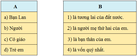 Chọn từ ngữ thích hợp ở cột A ghép với từ ngữ ở cột B để tạo thành câu kể Ai là gì?