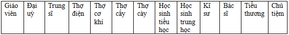 Con đọc kĩ các nghề nghiệp, chú ý đến tính chất công việc của từng nghề rồi sắp xếp vào các nhóm thích hợp.