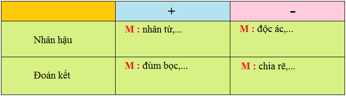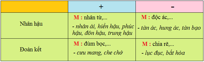 (Cột có dấu + để ghi các từ thể hiện lòng nhân hậu hoặc tinh thần đoàn kết.