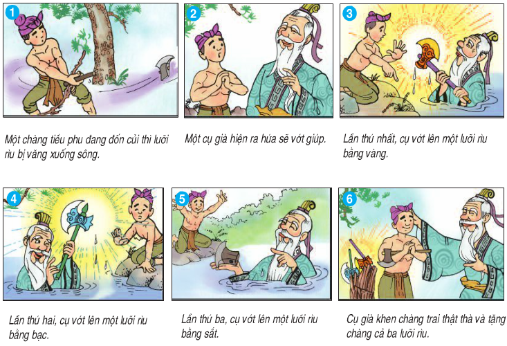 –  Tranh 6: Cụ già khen chàng trai thật thà và tặng cho chàng cả ba lưỡi rìu.