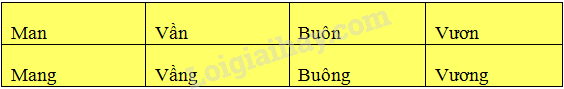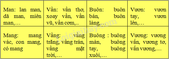 mong ngóng, trong trắng, lang thang, loáng thoáng, lùng bùng, lúng túng, lông bông, văng vẳng, vang vang, sang sáng,…