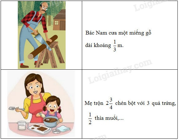 Đọc một số tình huống sử dụng phân số, hỗn số nêu trong các tranh vẽ dưới đây: