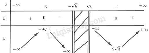 Từ đó ta thấy hàm số đạt cực đại tại \(x = -3\), đạt cực tiểu tại \(x =3\) và \({y_{CT}} = y(3) = 9\sqrt 3 ;\) \({y_{CD}} = y( – 3) =  – 9\sqrt 3 \)