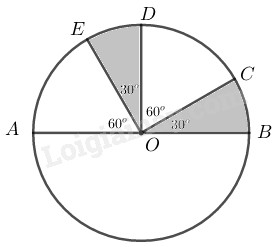 Cho đường tròn tâm \(O\) đường kính \(AB.\) Các điểm \(C, D, E\) cùng thuộc một cung \(AB\) sao cho \(sđ \overparen{BC} =\dfrac{1}{6} sđ \overparen{BA};\) \( sđ \overparen{BD} = \displaystyle{1 \over 2} sđ \overparen{BA};\)\( sđ \overparen{BE} =\displaystyle{2 \over 3} sđ \overparen{BA}.\)